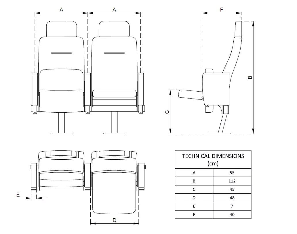 A high-back VIP seat with leather upholstery, plastic armrests, and a padded headrest for full upper-body support. This model offers maximum comfort for directors, VVIP guests, or exclusive hospitality areas. Designed to impress while meeting all stadium durability standards.